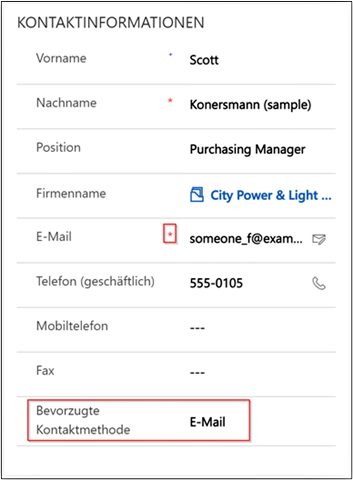 Zu Beginn möchte ich Dir ein einfaches Beispiel zeigen, um den grundlegenden Aufbau zu verdeutlichen. Am Kontaktdatensatz eines Kunden habe ich in meinem Dynamics-CRM die Option, eine „Bevorzugte Kontaktmethode“ festzulegen. Bei der Auswahl des Wertes „E-Mail“ hast Du für Dein Unternehmen festgestellt, dass es sinnvoll ist, dass das Feld „E-Mail“ auf dem Kontaktformular für Deinen Kunden zu einem Pflichtfeld wird.