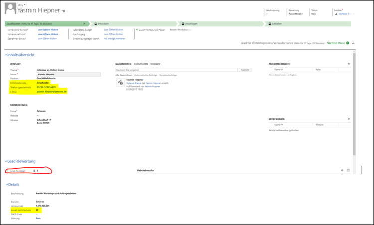 Wenn auch dieser Workflow aktiviert wurde, sieht man die Gesamtpunktzahl der Leadbewertung am Lead.